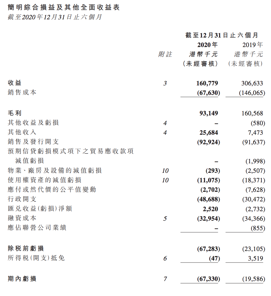 作为一家港股上市公司,这对于传递娱乐目前主要有影视剧制作、艺人经纪等业务,但业绩并不是很好,最近公布的2020年6-12月财报显示,半年内营业收入1.61亿港元,相比较2019年同期下降超过60%。而净利润方面,期间亏损6733万港元,相比较于2019年同期亏损扩大三倍。