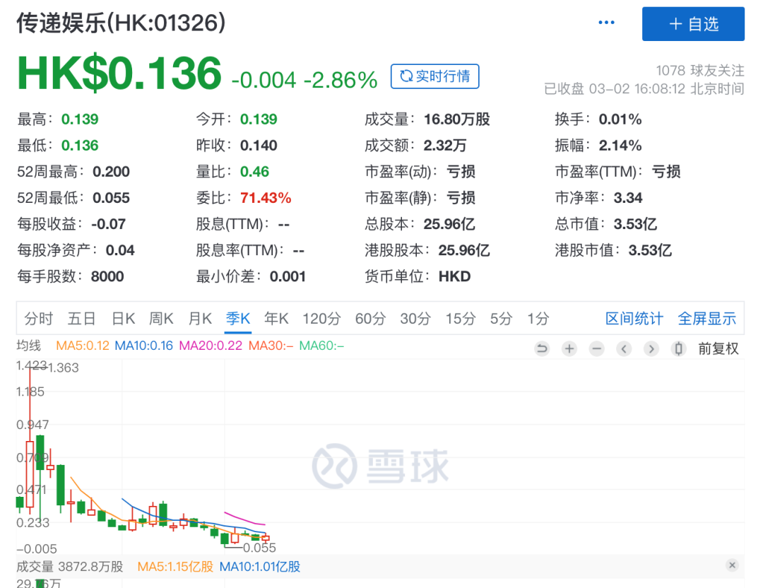 此外传递娱乐还面临着负债高企、商誉高悬等问题,如果不是张量一直在持续输血,传递娱乐可能难以长期支撑。这样的一家公司还有未来吗?这事很难说,资本市场给出了市场的答案:目前传递娱乐的股价0.136港元/股,市值3.5亿港元(约合人民币3亿元)。