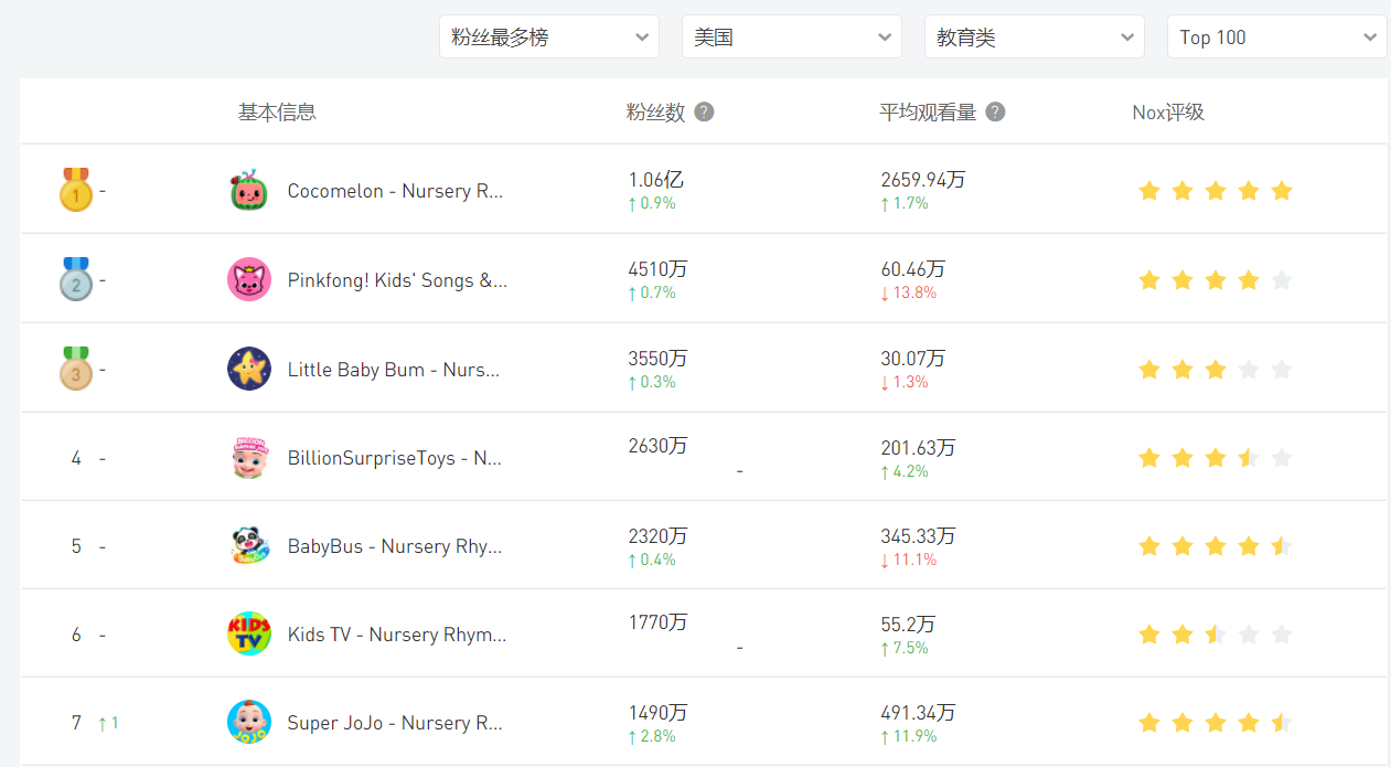 另外,YouTube的广告分成,也是不容忽视的一笔收入来源。YouTube频道显示,BabyBus账号已拥有2330万位订阅者。根据网络营销数据库Noxinfluencer显示,截至3月2日,在YouTube美国教育类粉丝数量排行榜上,BabyBus的粉丝数排在第5位,在总排行榜上排在第151位。