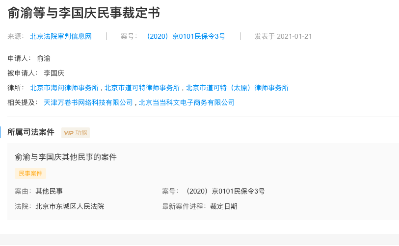 据北京法院审判信息网消息,俞渝与李国庆民事裁定书于1月21日公布,法院裁定:一、禁止李国庆殴打、威胁、辱骂申请人俞渝。二、禁止李国庆骚扰、跟踪、独自接触申请人俞渝。三、禁止李国庆进入和接近申请人俞渝住所。