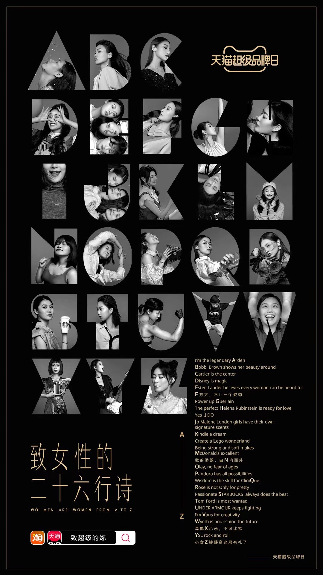 在天猫3.8节“致女性的二十六行诗”的广告营销中,同样传递了多元化审美、打破年龄焦虑、鼓励自由选择的价值观,诸如“美各不同,美美与共”“女孩们,各有芬芳”的表达。