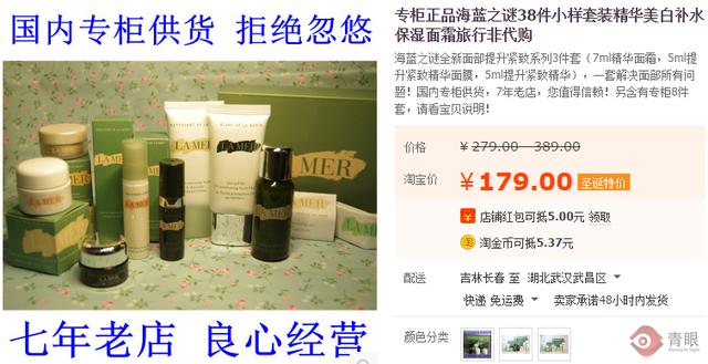 另一位常常网购的刘女士,在网上偶尔看到了一款化妆品小样卖的很便宜。于是在淘宝网输入关键词“化妆品小样”进行搜索,得到近8535件商品信息。这些产品多为国际大牌,平时在专柜购买正品时,一套就上千或是过万。但在这里,原本上万的海蓝之谜套装,小样仅以174元成交,买家甚至承诺100%正品保障。