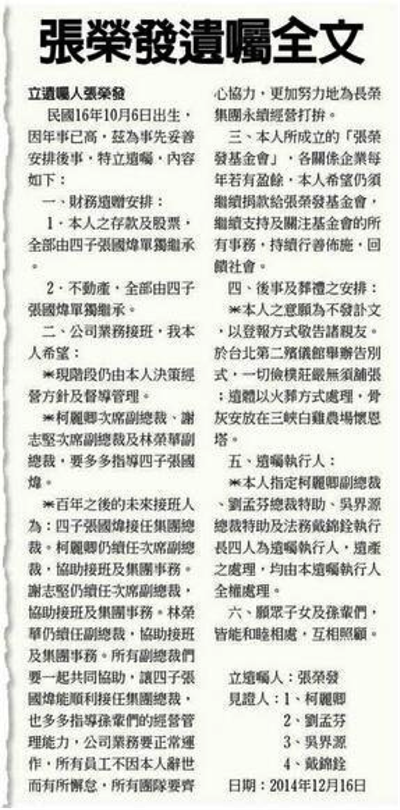大房去世后,张荣发更在大房子女的强烈反对中,在不到1年内将二房明媒正娶,然后还留下那份看起来最偏心,但最终可能一切事与愿违的遗嘱。