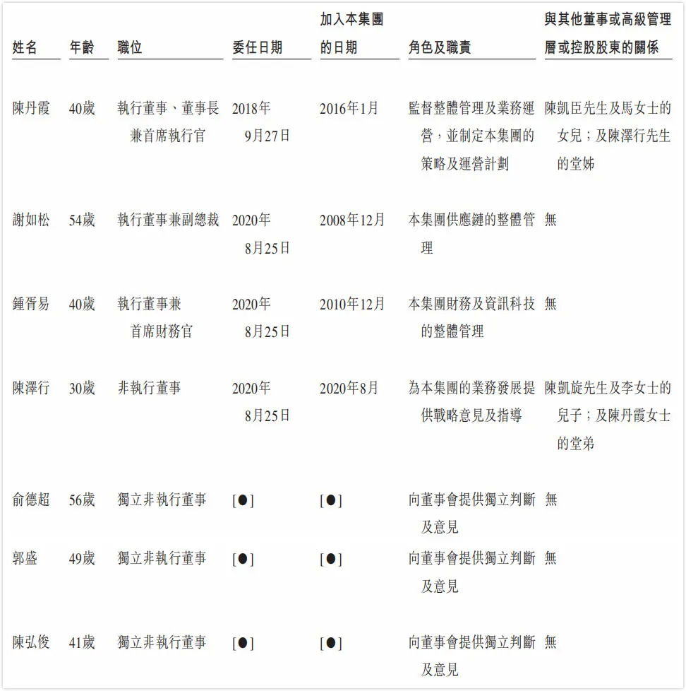 朝云集团执行董事为陈丹霞、谢如松、钟胥易,非执行董事陈泽行,独立非执行董事俞德超、郭盛、陈弘俊,陈丹霞及陈泽行均为陈氏家族的成员。