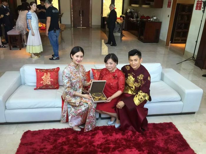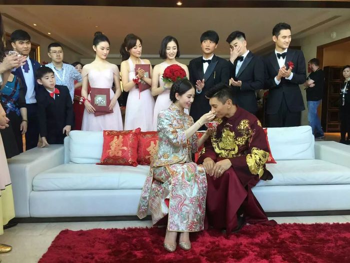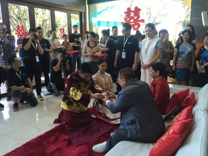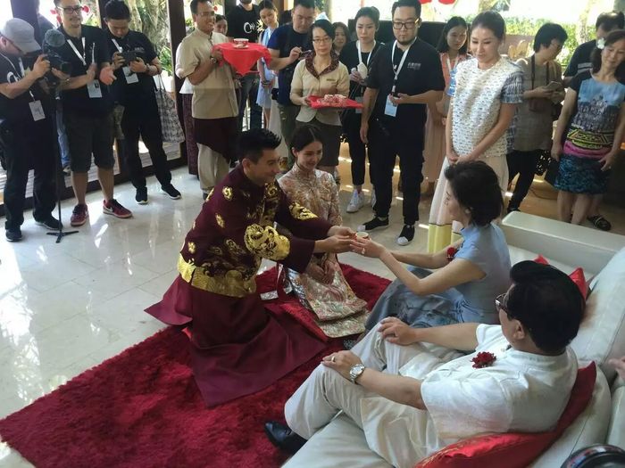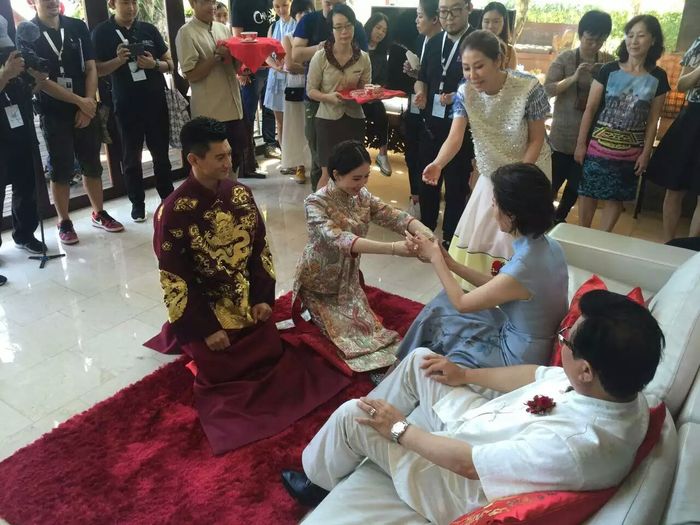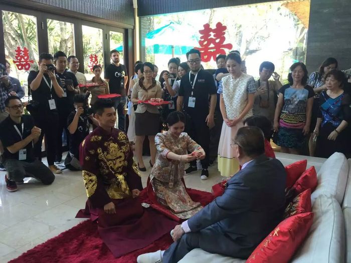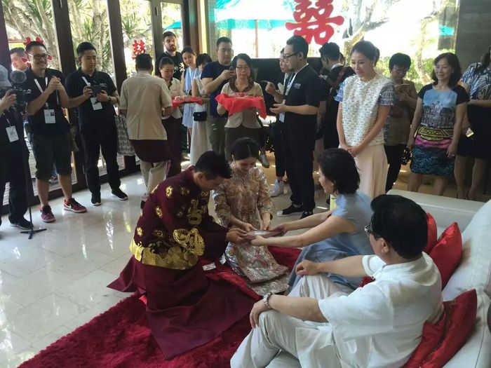 7. 刘诗诗与吴奇隆向吴奇隆父母敬酒,吴奇隆妈妈穿大红礼服喜气