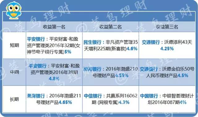 收益排名。将上面12个银行进行排名,短中长期收益前三名如下(如果收益相同,按期限排名,期限越短越靠前):