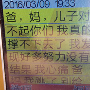 “爸、妈,儿子对不起你们,我真的撑不下去了,我发现好多努力没有结果,我心痛。爸、妈,我跳了,别给我收尸,太丢人。爸、妈,来世做牛做马报答你们。”3月9日晚上7点33分,郑先桥收到儿子郑德幸发来的最后一条短信。