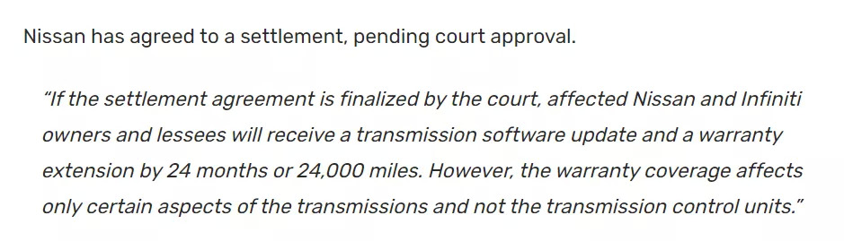 由于大量故障投诉,2016年日产不得不作出回应:对CVT变速箱进行软件升级,延长2年/24000英里质保(变速箱某特定部分,并非整个变速箱),对此前出现问题的车辆进行赔偿。