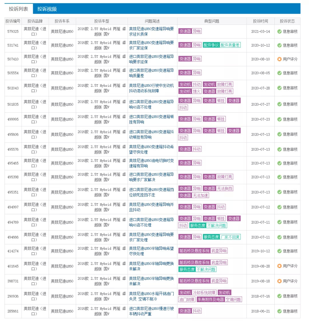 2016年就有媒体首次曝光同类问题。2014款英菲尼迪QX60,在经历了一两年使用之后,这款车型的变速箱问题集中爆发,情况与海外市场一致,抖动、行驶中失灵,多次更换仍存在问题。在车质网的投诉页面,3.5L车型与2.5T车型的变速箱故障投诉数量相当,最早登记年份是2016年。