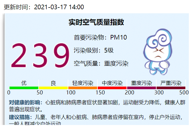 据北京市生态环境局网站消息,截至2021年3月17日14:00北京实时空气质量指数为239,属重度污染。目前的首要污染物为PM10,污染级别为5级。