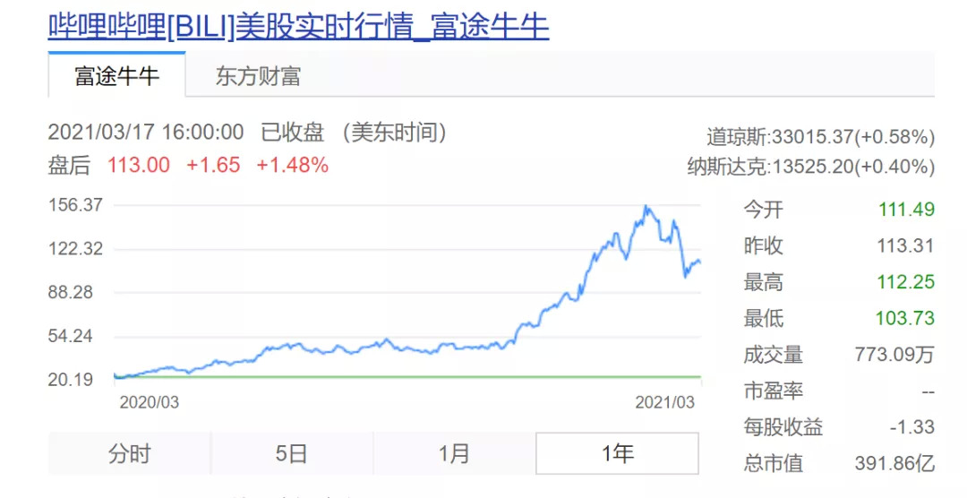 自2020年12月至今年2月上旬,B站股价节节攀升,于2月11日达到157美元的高位,此后呈现震荡下行的趋势。随着二次上市的消息传来,股价出现回弹。截至3月17日收盘,B站股价为113美元。
