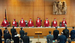 当庭丁用宏亮的声音宣布:“联邦宪法法院!”,法庭内三百人同时起身,注视八位宪法法官步入法庭,全场鸦雀无声。