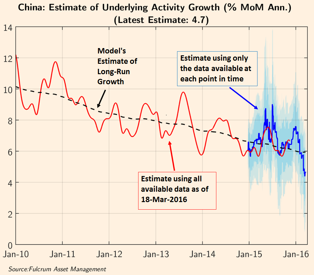 最新的政策改革正面临着经济形势自年初以来不断恶化的局面。下图来自支点资产管理公司(Fulcrum)的“即时预测”(nowcast)模型,概括了本10年中国经济增长的主要特征。