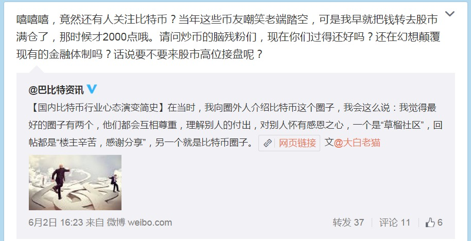 不尽然,有的人起了个大早,却赶了个晚集,或是与比特币擦肩而过,或是倒在了黎明前,匆匆离场,即便是2011年入场的比特币早期布道者,依然中途“放弃”,站在了比特币对立面。