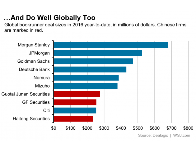 Dealogic数据显示,今年到目前为止,由于中资券商积极承销中国公司IPO,已经有三家中资券商跻身全球十大IPO承销行之列,分别是国泰君安、广发证券和海通证券。国泰君安国际总裁阎峰曾表示,中资券商在香港的投行业务发展是最迅猛的,此前外资投行独霸天下,而两年前中资投行的市场份额已经超过30%。