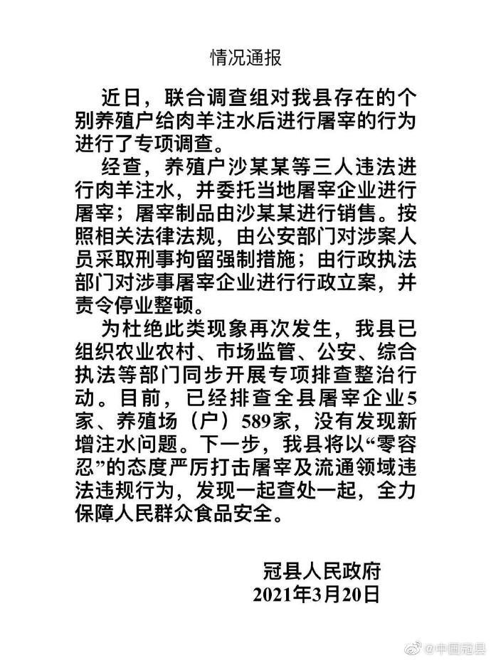 为杜绝此类现象再次发生,冠县已组织农业农村、市场监管、公安、综合执法等部门同步开展专项排查整治行动。目前,已经排查全县屠宰企业5家、养殖场(户)589家,没有发现新增注水问题。