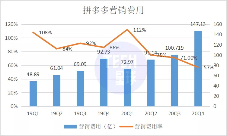 拼多多财报显示,第四季度其总运营支出为170.694亿元。其中,销售与营销支出为147.13亿元,同比增长59%,主要出自广告费用、促销和优惠券费用的增加。环比来看,去年同期,仅为92.73亿元。可见,拼多多为了获取更多的用户,仍在继续烧钱。