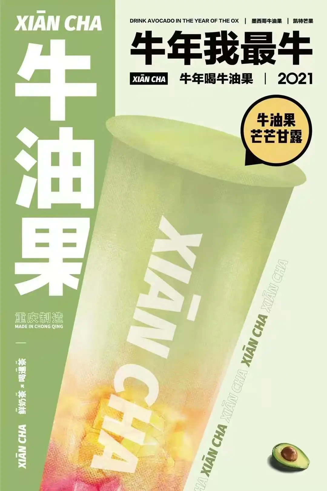 暹茶在其牛油果芒芒甘露的产品介绍中,提出解渴、解辣的提法,针对牛油果的海报打出“牛年我最牛”的口号,让顾客有了“自我肯定”的内在联想。