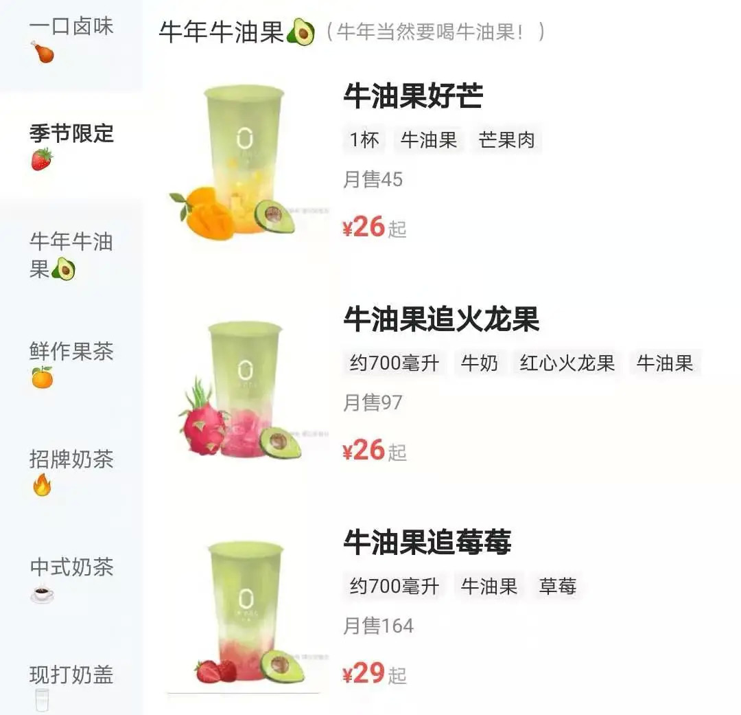 综合这些产品售价来看,多数牛油果产品的价格在23~28元/杯。