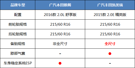 这两款车型都是是采用了16寸的轮胎,在笔者看来的确不是很厚道,毕竟是中型车了,16寸的轮胎的确有点小,要是都改成17寸就更好了。不过,要考虑到入门级车降低成本的理念,还是非常可以理解。雅阁采用了非全尺寸的备胎,让笔者也非常意外,毕竟一般以备胎厚道为优势的日系品牌,这样的情况还是很少出现的。另外,凯美瑞最低配车型也配备了膝部气囊,在笔者看来也是非常厚道,属于业界良心,雅阁则没有。不过,雅阁标配了ESP,凯美瑞没有,这也是雅阁的一大优势。