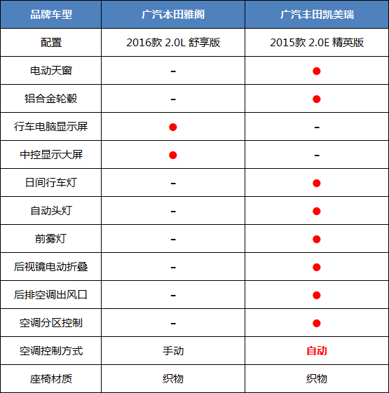 说到实用配置,可能是原本凯美瑞定价比较高的原因。凯美瑞在配置方面的优势还是非常明显的,比如说电动天窗、铝合金轮毂、日间行车灯、电动折叠后视镜、后排空调出风口、空调分区控制、自动空调等都一应俱全。雅阁就没有天窗可以理解,但是最低配都没有铝合金轮毂就有点坑爹了!另外,前雾灯、日间行车灯、后排空调出风口都没有,对于一款中型车来说,这配置也有点寒酸了。不过还好,雅阁还有行车电脑显示屏和中控显示大屏,看上去也不是完败。两款车型都没有配备真皮座椅,也在笔者的意料之中。