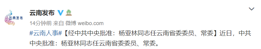 据@云南发布 微博消息,近日,中共中央批准:杨亚林同志任云南省委委员、常委。