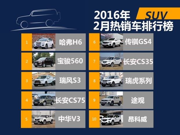 我们先来看看今年前两个月SUV市场的销量榜。哈弗H6自然是理所当然的冠军,2月与前两月销量分别为3.31万辆和7.53万辆。竞品中卖得最好的宝骏560,这两个数字分别为3.1万辆和7.1万辆。仍有差距,但差距已经非常小。