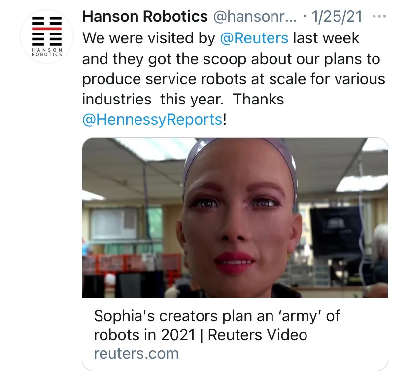 1月,路透社发布了关于Sophia的开发方Hanson Robotics的独家报道。