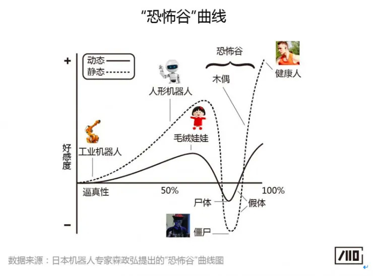 仿真度很低,人们不怕,因为知道那是假的,仿真度高到一定程度,人们有时就不确定真假,把真人当假人,把假人当真人,都会吓到人。然而当仿真度再继续上升的时候,人的好感度又会继续提升。