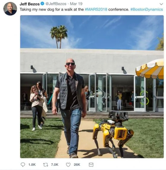 Spot Mini虽然是工业用的特种机器狗,并不具备情感交互功能,但最初也曾作为亚马逊CEO贝佐斯的新“宠物”而走红。