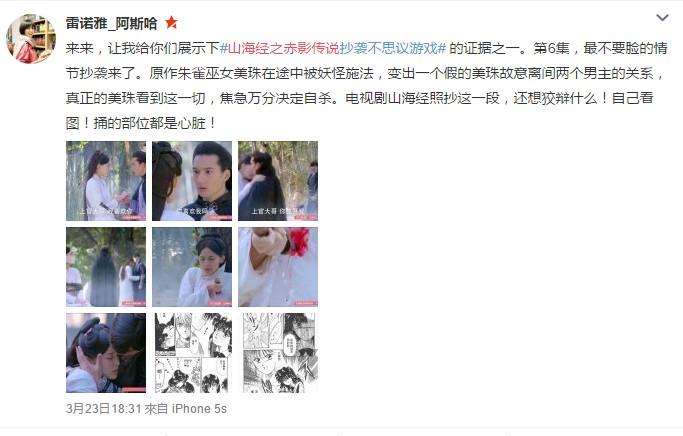 至此,这出抄袭官司陷入两方各执一词的境地。其实,《山海经之赤影传说》并不是第一部被指抄袭日漫的电视剧,前几年,一部由“80后新锐编剧代表”马广涛编剧的电视剧《女娲传说之灵珠》,也被指抄袭了著名日漫《犬夜叉》。编剧回应称自己“是动漫迷”,“借鉴了《犬夜叉》的元素,但两者的差别还是挺大的”。虽然群情激愤,但这件事最终不了了之了。
