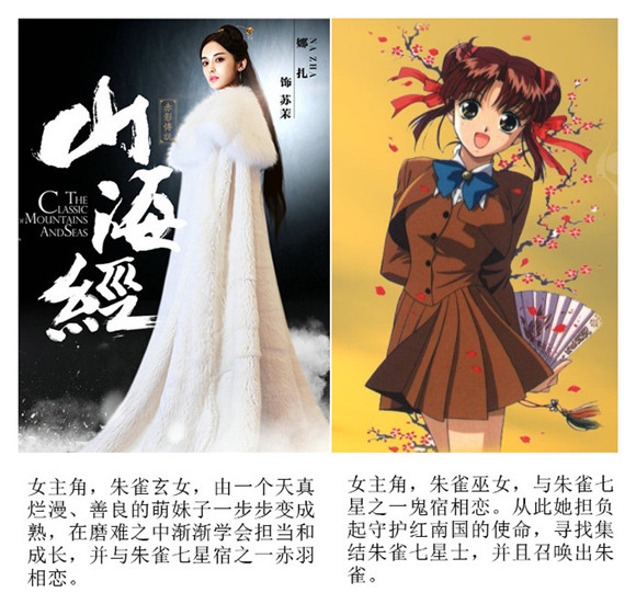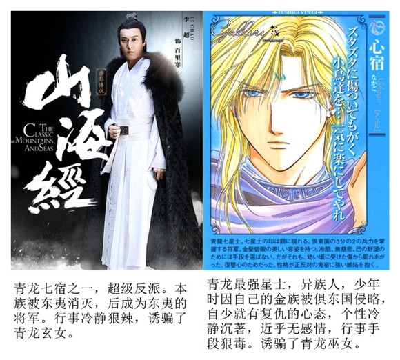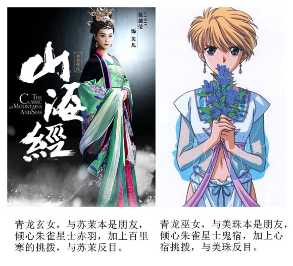 《山海经之赤影传说》:苏茉(娜扎)和苏芙(蓝盈莹)本来是一对关系要好的姐妹,同时也是朱雀玄女和青龙玄女。青龙玄女暗恋张翰饰演的赤羽,但遭到拒绝,在青龙守护星宿百里寒的诱骗下,青龙玄女为东夷召唤出了青龙。