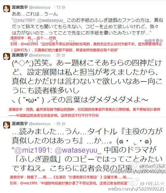 对此,有中国网友曾经向漫画作者渡濑悠宇求证,作者表示:“虽然漫画取材于中国的四神,但后面的故事是我自己想的哟,好像是中国的电视剧抄袭了《不思议游戏》呢……”