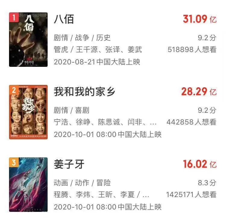 随着全球电影市场因疫情的影响而遭遇打击,国内电影市场率先恢复营业展现了国内电影市场的生命力。数据显示,2020年中国电影总票房达到204.17亿元,其中国产电影票房为170.93亿元,占总票房的83.72%;城市院线观影人次5.48亿。其中,《八佰》《我和我的家乡》以31.09亿、28.3亿位列前两名。