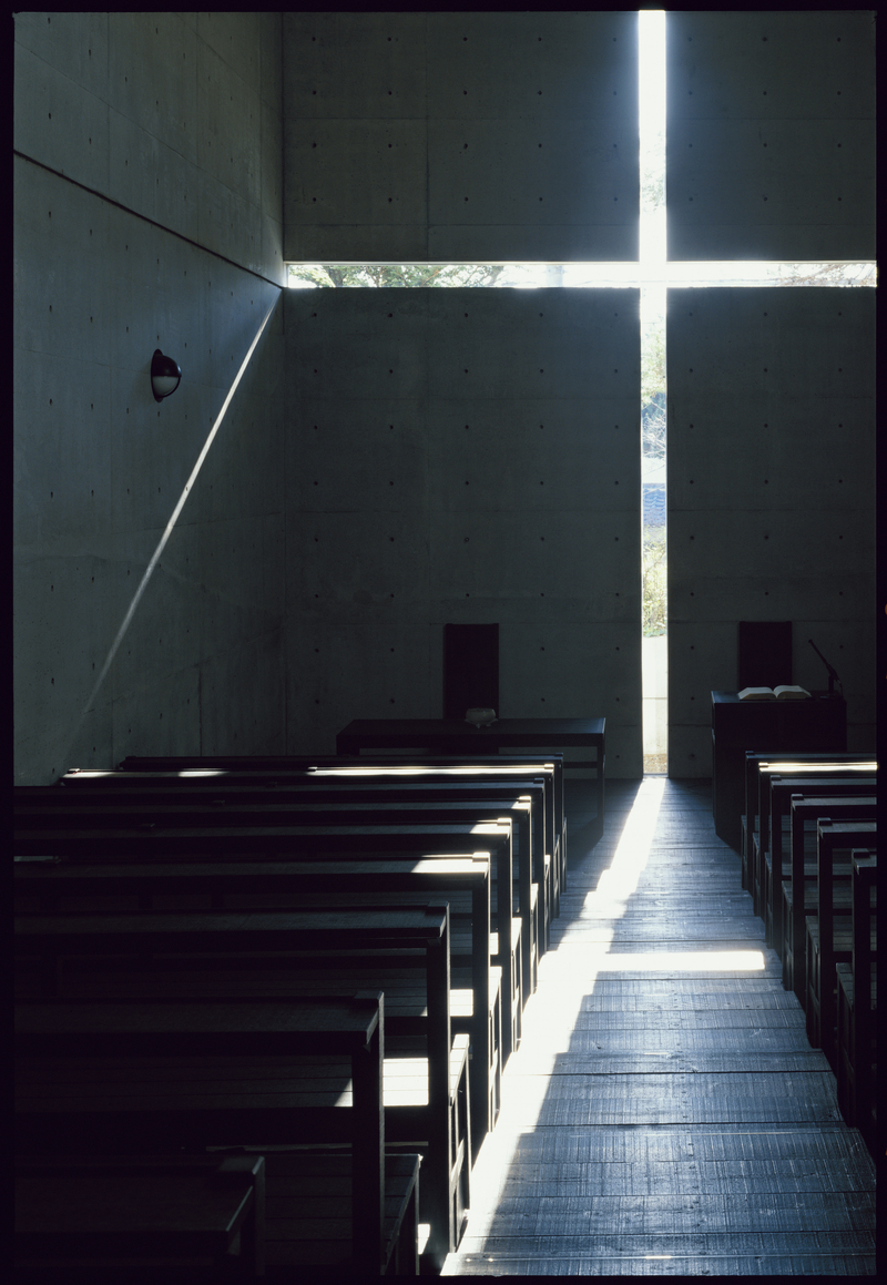 对于安藤来说,郎香教堂向他证明了“追逐光线也能创造建筑”,这成为他在设计“光之教堂”(1989)时的重要灵感来源,让他得以在预算极其有限的情况下,创作了一件传世之作:“相对于郎香教堂丰富多彩的光线,我是采取限定开口部分、彻底删除包括材料在内的其他建筑要素的方式,让穿过十字架切口的光在黑暗中浮现。因为我希望象征性的光十字架,可以成为以祷告为目的而聚集于教堂的人们的心灵指标。虽然在规模上这是非常小的建筑,不过再度让我思考到,光的力量足以影响人类精神。”