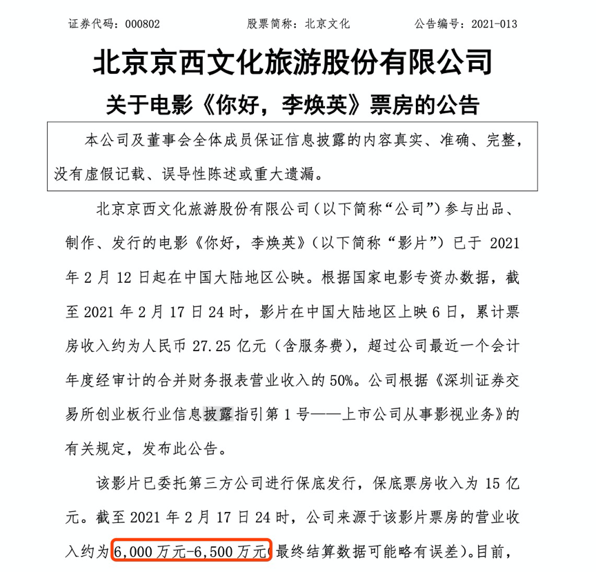 这一系列事件的发生,让外界注意到北京文化的缺钱情况超乎想象。而更令人想不到的是,春节档大卖的爆款电影《你好,李焕英》,北京文化作为第一出品方,却只赚了个零头。电影票房27亿的时候,北京文化公告称只赚了6000万。如今票房53亿了,北京文化也最多只赚了约1.2亿。