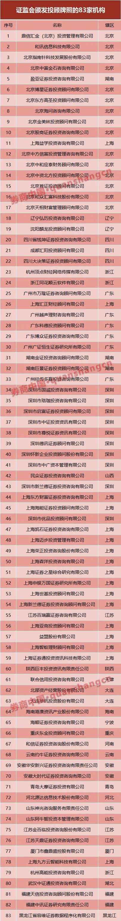 截至2月21日,证监会官网披露,持牌的证券投资咨询机构包括华讯投资在内合计有83家,券商中国记者注意到,这些投顾机构大多数以民营股东背景为主。