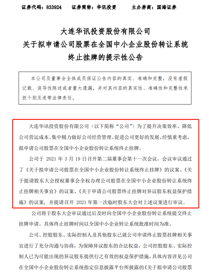 3月22日,华讯投资公告,为提升决策效率、降低公司营运成本等,拟申请在新三板终止挂牌。