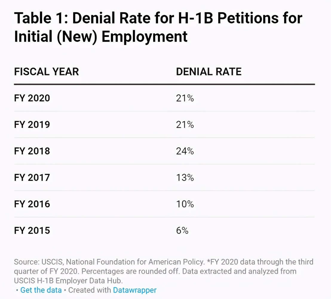 所以这四年来,H1B的拒签率一直很高。外籍留学生想取得美国身份,成功率只有30%左右。