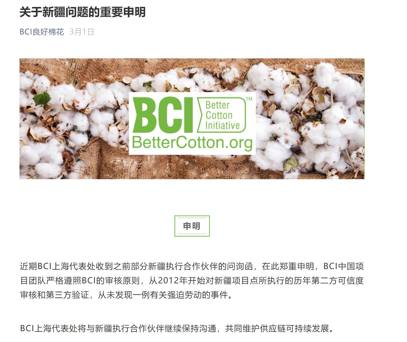 BCI成员,中国品牌安踏则在3月24日表示正在启动相关程序,退出该组织。公司声明称,安踏一直采购和使用中国棉产区出产的棉花,包括新疆棉,在未来也将继续采购和使用中国棉。