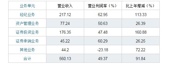 中信证券在此情况下录得收入仍相当可观。从营业收入构成上来看,经纪业务和投资业务收入占比最大,分别为217.12亿元和176.35亿元,资管业务和承销业务收入增速较慢,分别为77.24亿元和45.22亿元,比上年增加26.39%和26.25%。