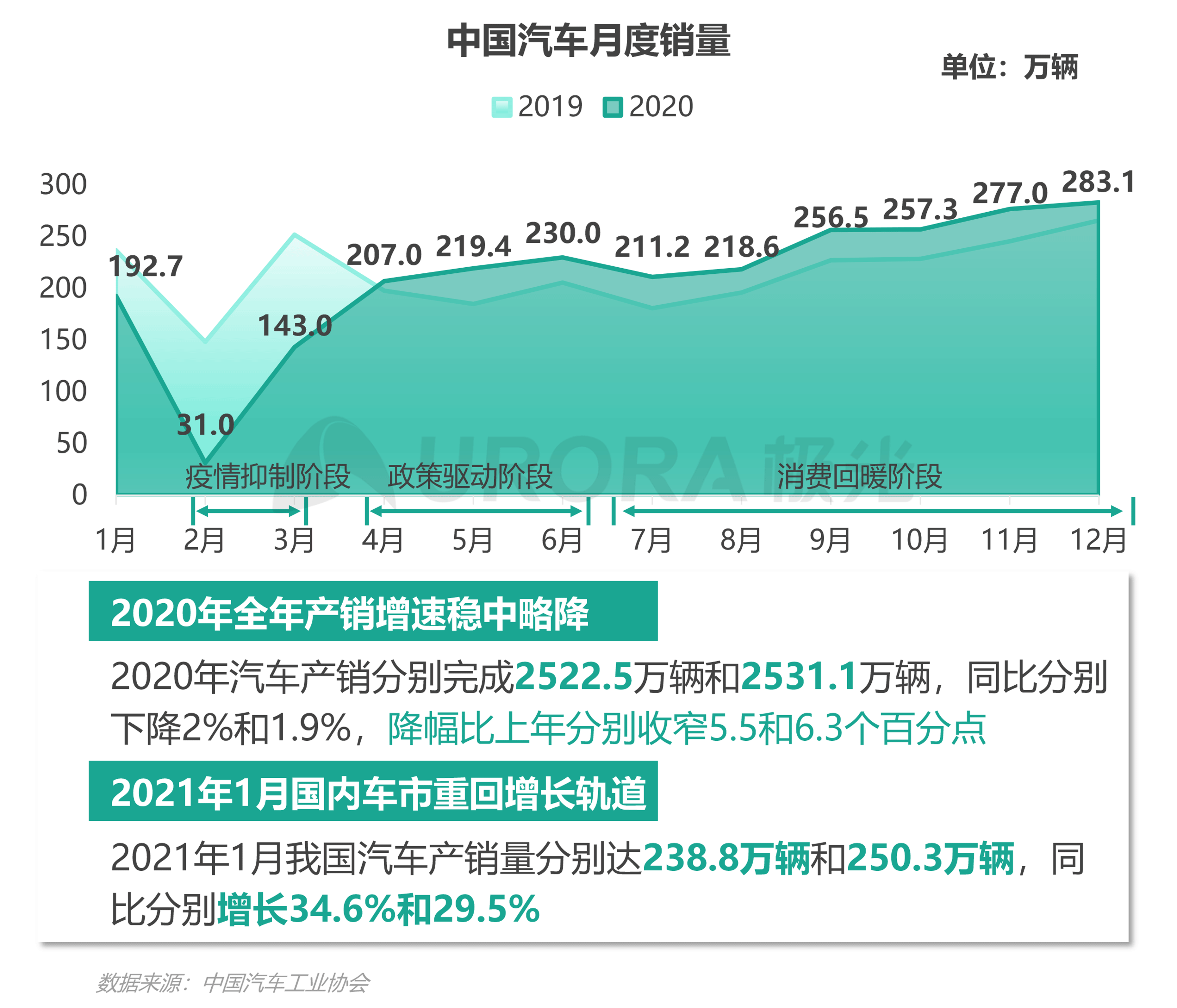 2020年受年初疫情影响我国车市几近腰斩,后续疫情得到控制后,我国车市的消费需求回暖,叠加政策引导,汽车销量超越2019年同期水平,全年产销增速稳中略降,降幅比上年有所收窄。这样的势头更是延续到2021年;2021年1月,我国汽车产销量重现增长,一改2019年、2020年连续两年1月均以下滑开局的面貌,体现出我国车市转型升级背景下具有强大的韧性和巨大的潜力。