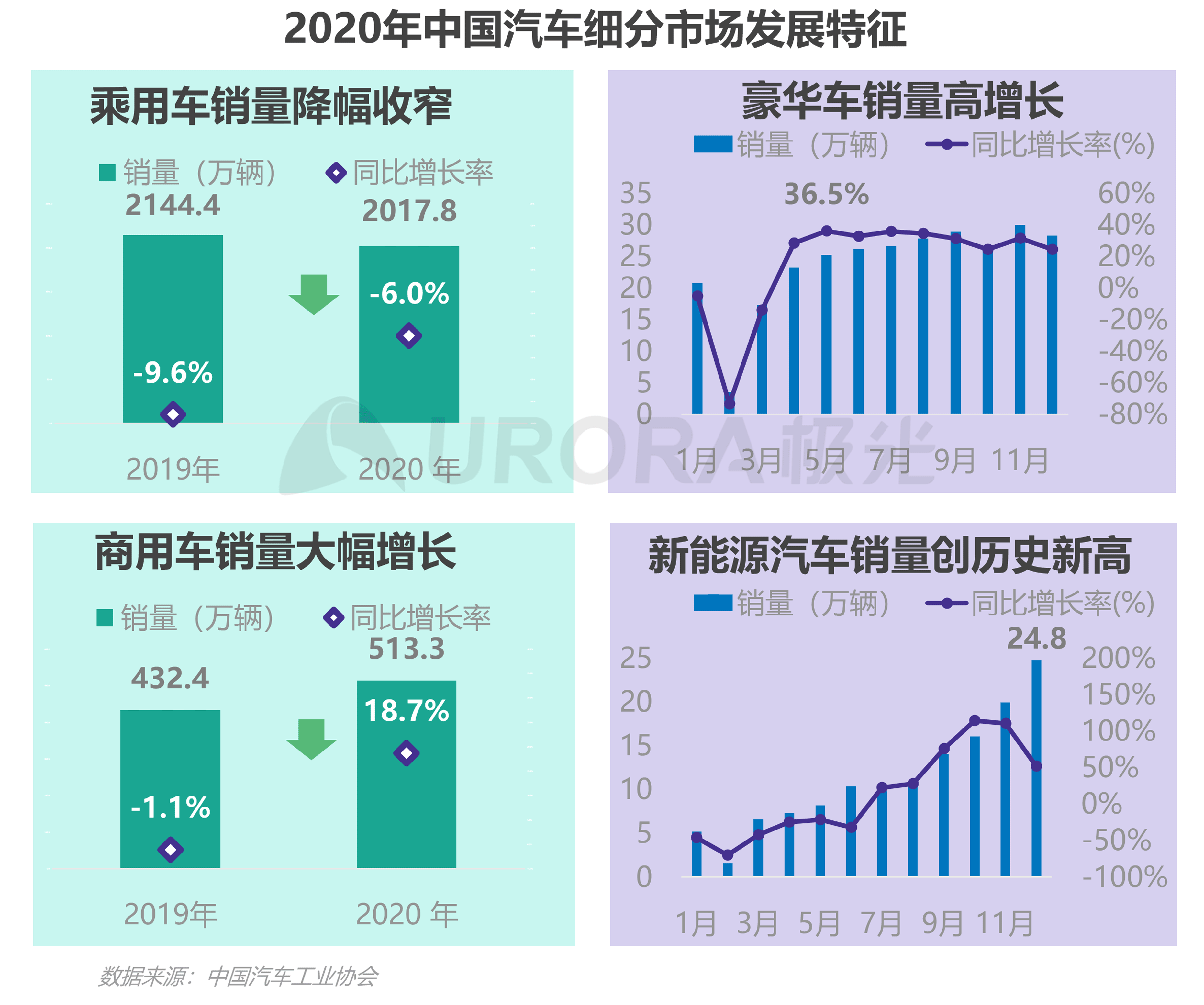 2020年中国乘用车销量为2017.8万辆,同比增长率为-6.0%,较上年降幅有所收窄;然而,在豪华车细分领域,自2020年4月开始,销量保持在30%左右的增速。受益于政府的经济发展措施,商用车销量走高,同比增长达18.7%。2020年,新能源汽车销量创新高,达117万辆,同比增长12%;在消费端的话题性也持续高涨,Tesla、蔚来、小鹏、理想、宏光miniEV等乘用车均得到市场广泛关注并产生可喜的销量。