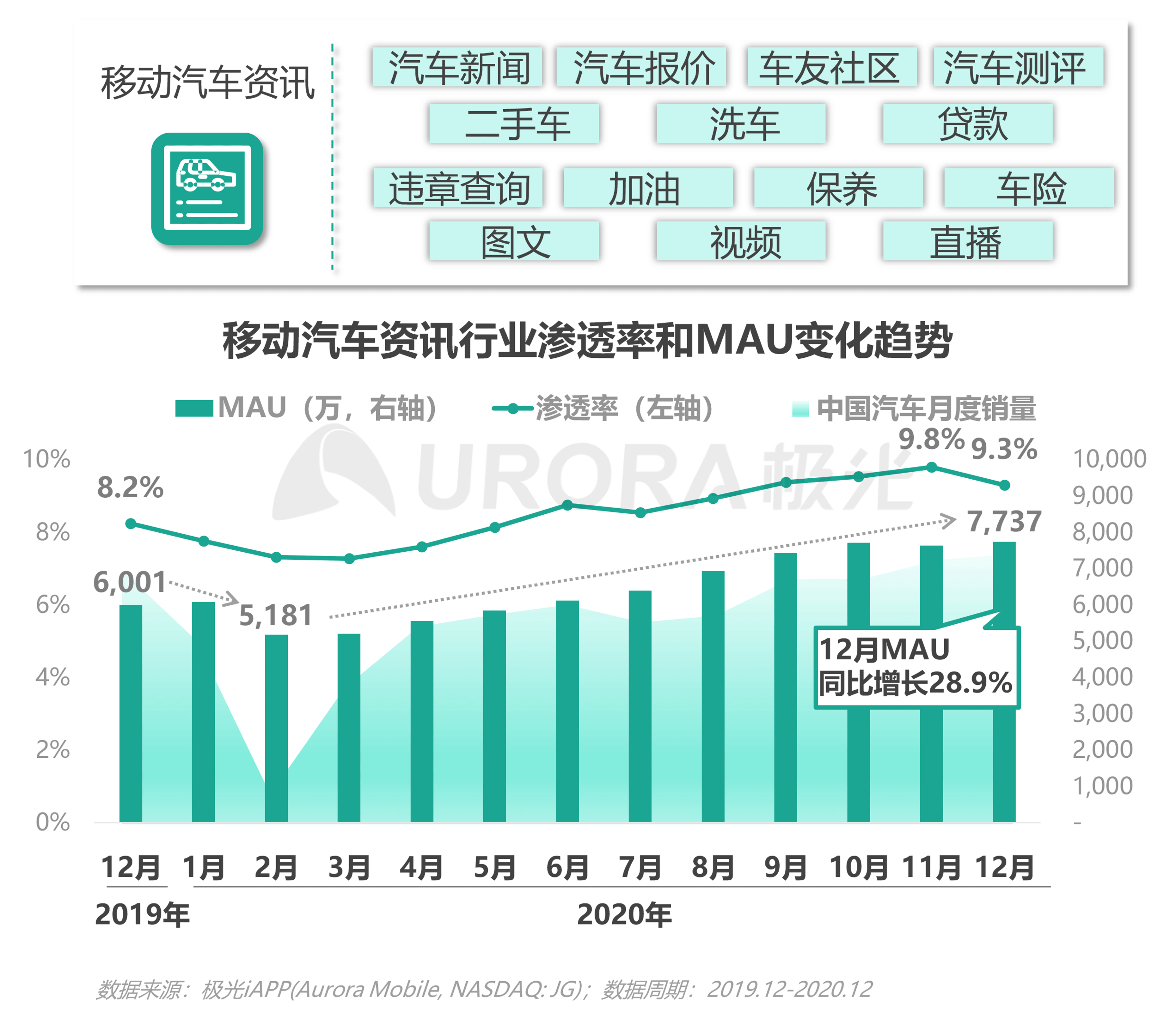 1、相较车市,汽车资讯2020年增长更为明显;截至2020年12月,移动汽车资讯行业渗透率同比增量达1.1个百分点,MAU同比增长率达28.9%。