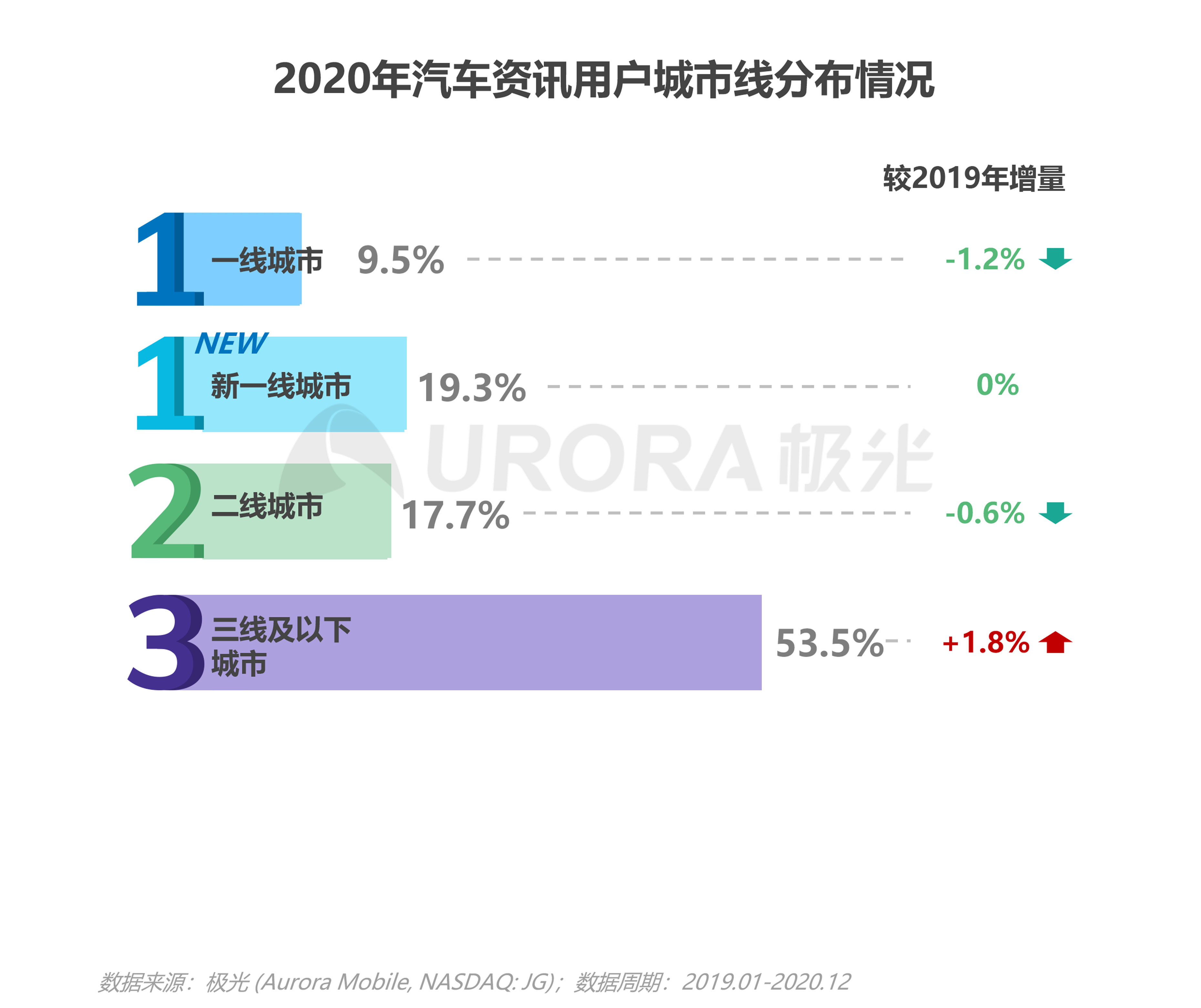 4、汽车消费在下沉市场存增量空间,2020年三线及以下城市汽车资讯用户比例提升1.8个百分点。