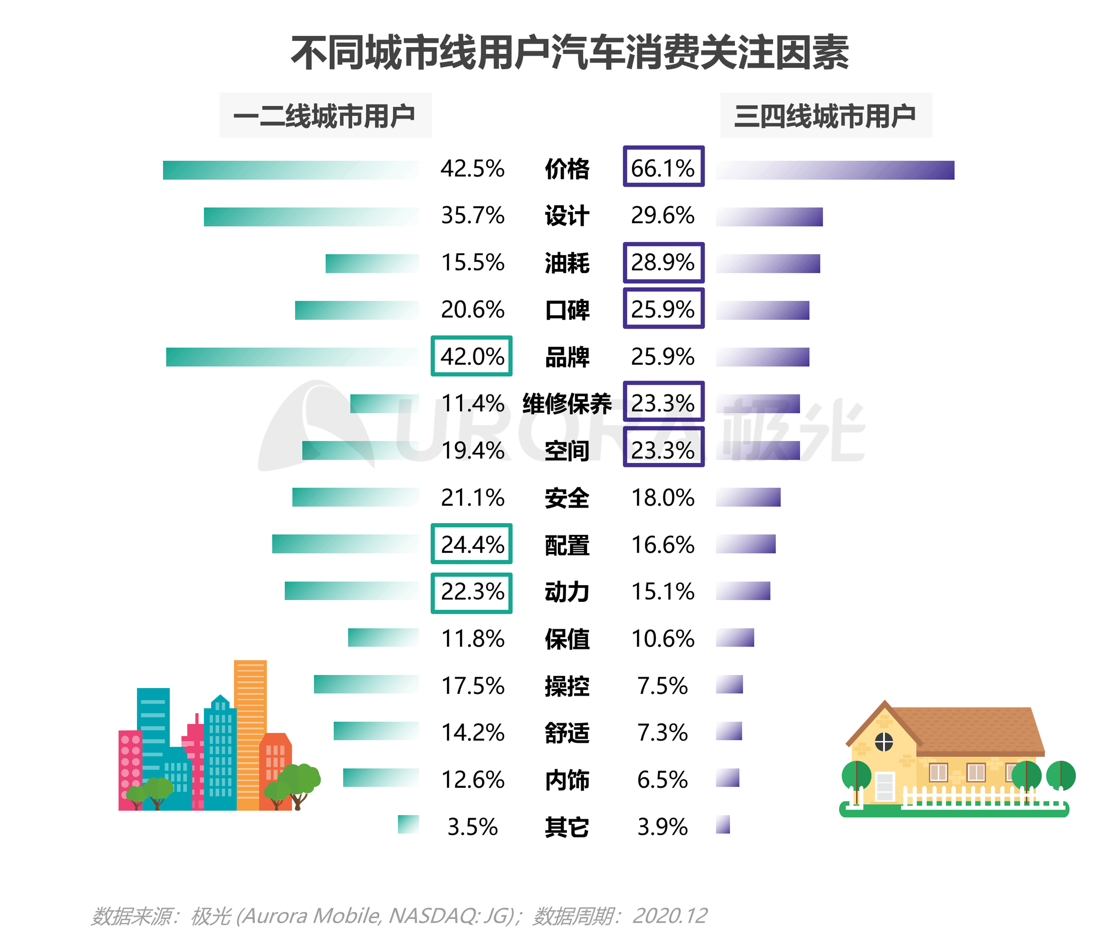 三四线城市用户为高度价格敏感型用户,66.1%的用户选择关注价格因素;相对一二线城市用户,油耗、口碑、维修保养、空间四方面是三四线城市用户更为关注的因素;一二线城市用户则更关注品牌、配置和动力。