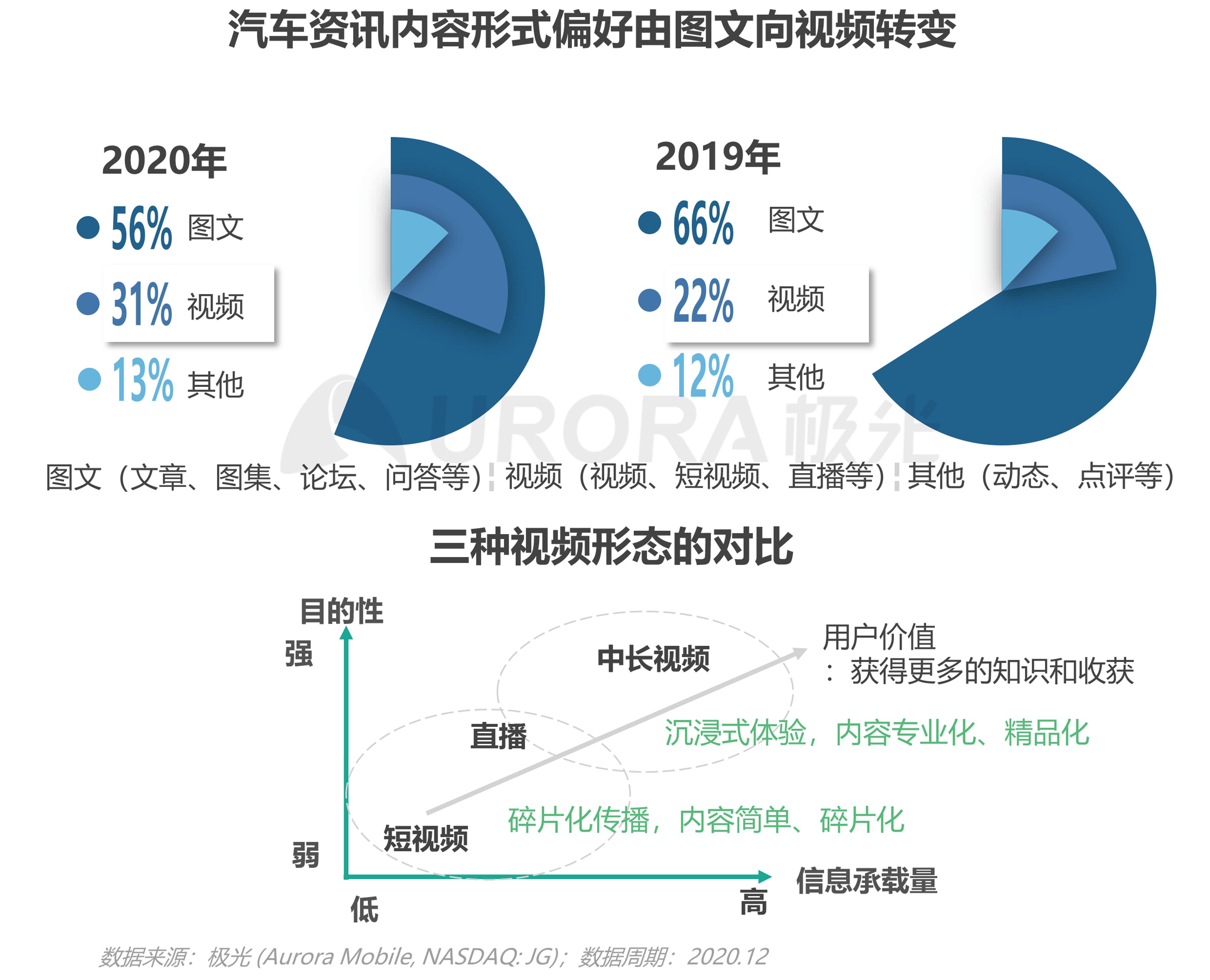对比2019年和2020年汽车资讯内容形式的分布,图文的占比由66%下降至56%,视频占比由22%上升至31%;视频无疑成为现在和未来争夺用户时间的重要形式之一。三种视频形式各具特色;短视频因内容爆点吸引用户好奇心;直播适合与用户互动,拉近品牌与用户距离;中长视频适合带有目的性的沉浸式停留观看;中长视频制作门槛高,生成的内容更具辨识度和区分度,从而构建内容护城河,并生成更多的商业价值;对于知识密度偏高的垂类资讯平台,汽车资讯的视频化竞争必将在中长视频中展开。