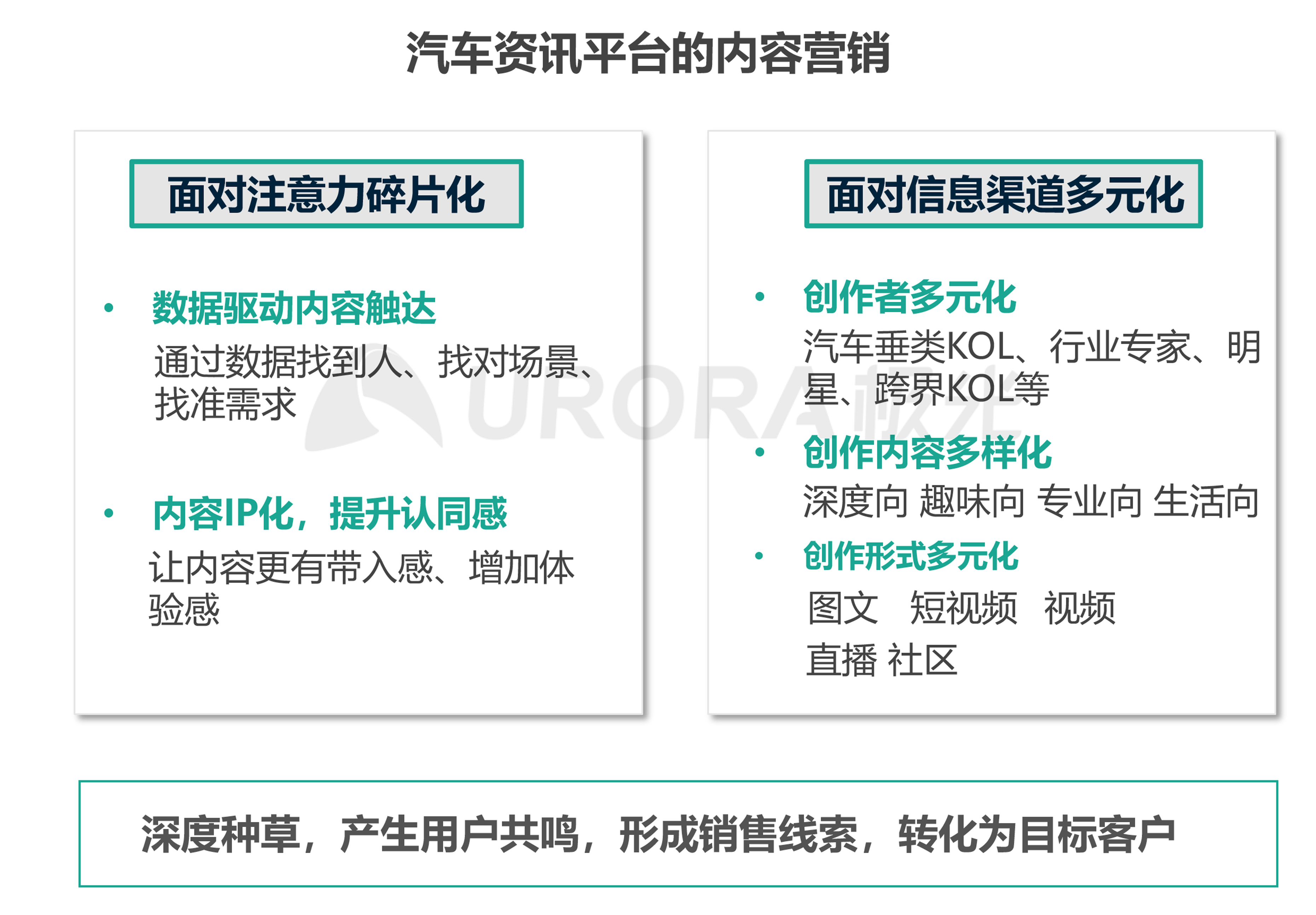2020年是汽车行业转型升级的深化阶段,疫情黑天鹅加速汽车产业营销线上化的进程,火热的短视频、新风口直播带货等多样的内容形式令车企应接不暇;在这个用户注意力碎片化、信息渠道多元化的时代,内容营销也正从浅层的品牌信息传递向用户兴趣爱好匹配、价值认同等深层互动演变。基于内容营销的演变,汽车资讯行业向内容IP化和渠道、内容形式多元化的方向发展,多点精准触达,产生用户共鸣,占领用户心智,最终达到品效合一的效果。