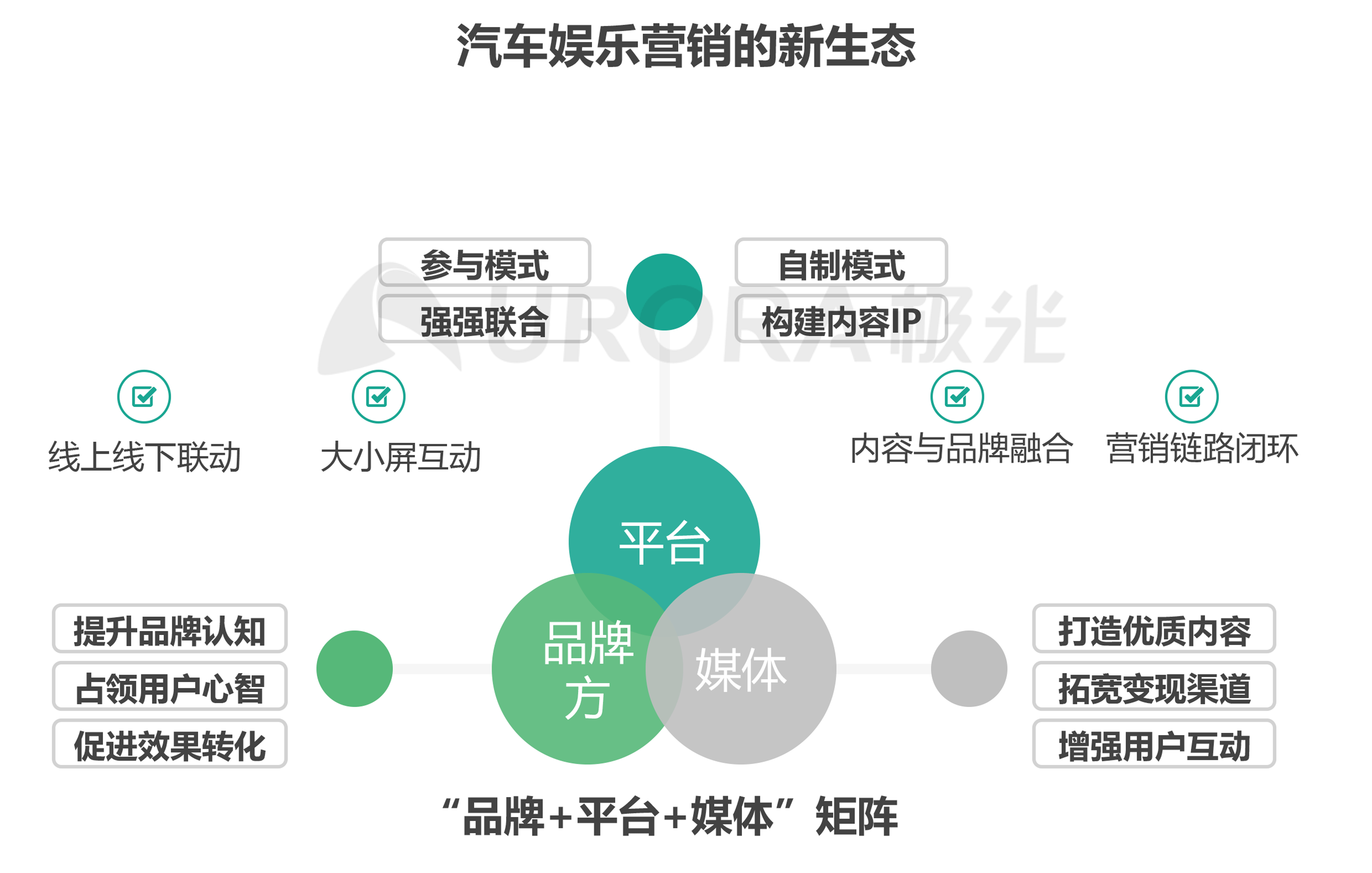 娱乐营销借助娱乐的形式与用户产生情感连接,增强品牌曝光度或增加品牌话题性,从而促进产品销售;用户从产品感知到购买之间有多重决策路径的选择,品牌方难以把握广告转化的效果;汽车资讯平台参与其中,与品牌方产生联动,深化娱乐内容与品牌的融合以及用户购买场景的转化,形成娱乐营销全链路的闭环,达到“媒体-平台-品牌”三方共赢的局面。参与节目仅仅是汽车娱乐营销新生态的开端;自制娱乐节目是汽车资讯平台在娱乐营销新生态的全方位探索;通过多屏多渠道联动为用户带来更多互动和更丰富的收看体验;通过主导娱乐节目,平台深入洞察用户消费链路的转化,为品牌方提升营销转化效果;这样的营销实践正在帮助汽车资讯平台建立内容IP,构建商业护城河。