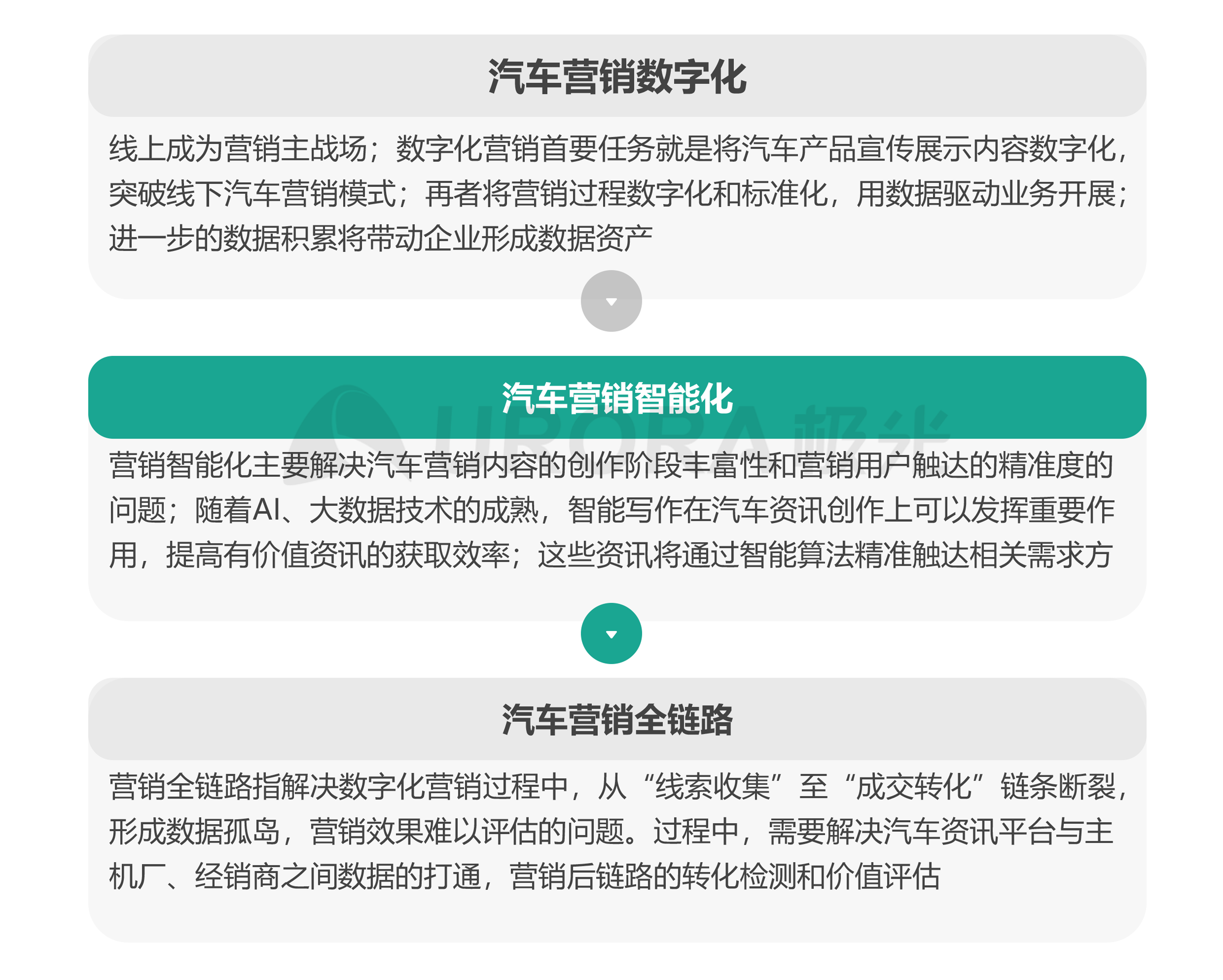 数字化时代,人工智能和大数据等技术正在颠覆传统营销方式,也成为整个汽车行业营销转型的契机;面对用户决策链路复杂化,媒介渠道多元化的趋势,数字化营销是解决当前困境的首要关键,这是一个巨大的工程,智能化手段可以加速营销效率的提升;全链路营销关注汽车消费者从触达到最终购买转化的全部行为链路,并考量每个环节的影响,从而驱动汽车消费行为。